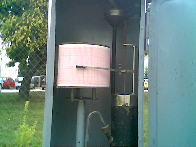 Ez az öníró csapadékmérő, nemcsak a lehullott csapadék mennyiségét méri meg, hanem annak a lehullási idejét és intenzítását is. Itt egy csövön keresztül jut be csapadék a műszerbe és egy írókar az óraműtől hajtott forgódobon lévő szalaghoz ér. Ezen a szalagon találhatunk mm-es beosztást 10mm-ig és egy időbeosztást órában. Ezt a szalagot naponta kell cserélni. Szinte percre pontosan megfigyelhető a csapadék kezdete és vége, továbbá még az hogy milyen intenzítással hullott a csapadék. Itt is tized mm-ben olvashatjuk le a csapadékmennyiséget. Ennek a gyűjtőhengre csak 10mm csapadékot tud tárolni, ezért 10mm után egy szívócsövön keresztül kiürül. A fagyok beállta előtt érdemes kiűríteni ha esetleg maradt benne kevés víz, mert a fagy tönkreteheti a mechanikai rendszerét.